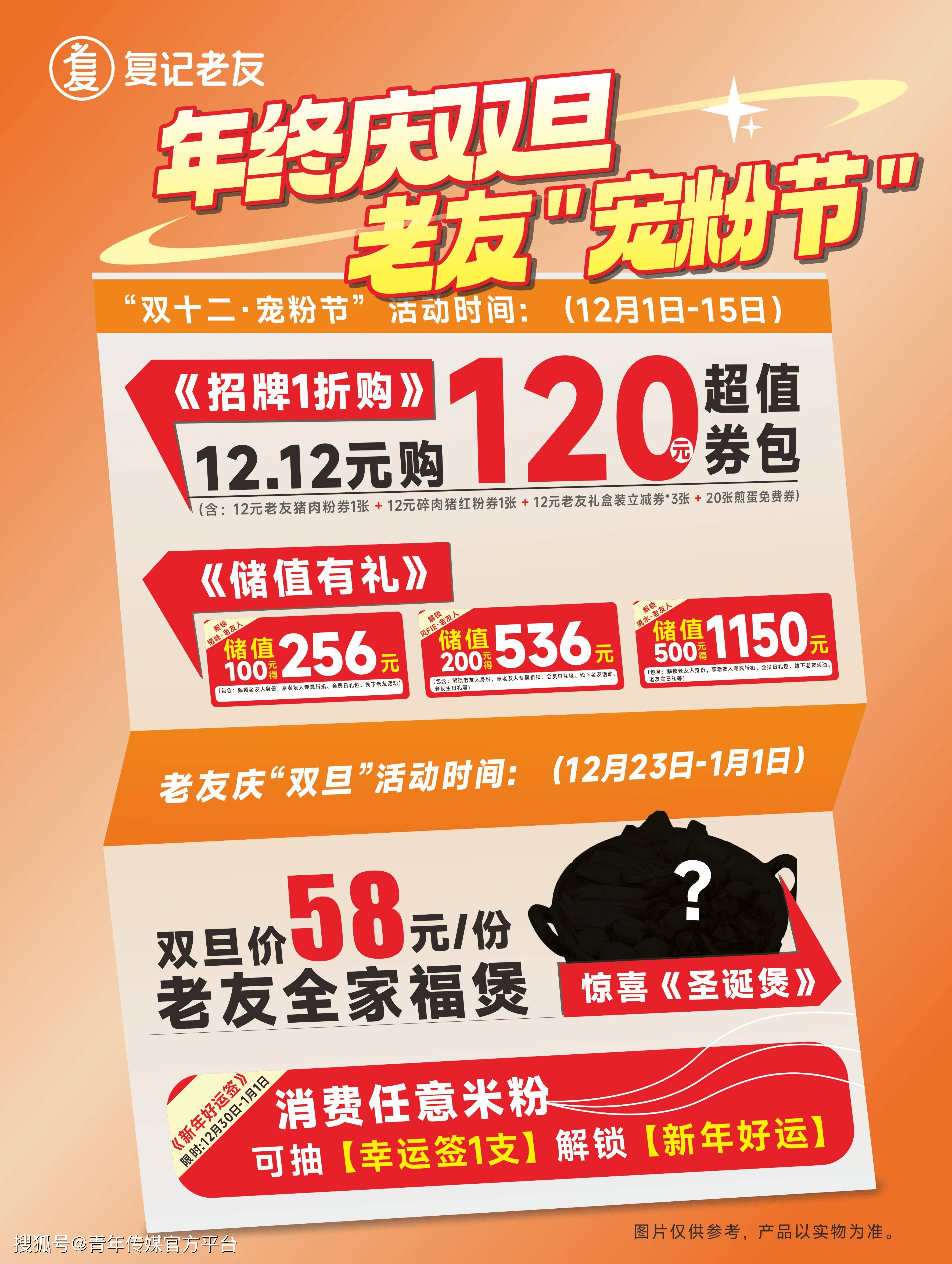 在歲末年初的溫馨時(shí)刻,復記老友精心籌備了一場(chǎng)盛大的“年終寵粉月”活動(dòng),回饋廣大顧客的支持與厚愛(ài),同時(shí)慶祝雙十二與雙旦節日的到來(lái)。本次活動(dòng)將貫穿整個(gè)十二月,通過(guò)豐富的促銷(xiāo)活動(dòng)和貼心的服務(wù),讓顧客在享受美食的同時(shí),感受到濃濃的節日氛圍和復記老友的溫暖關(guān)懷。